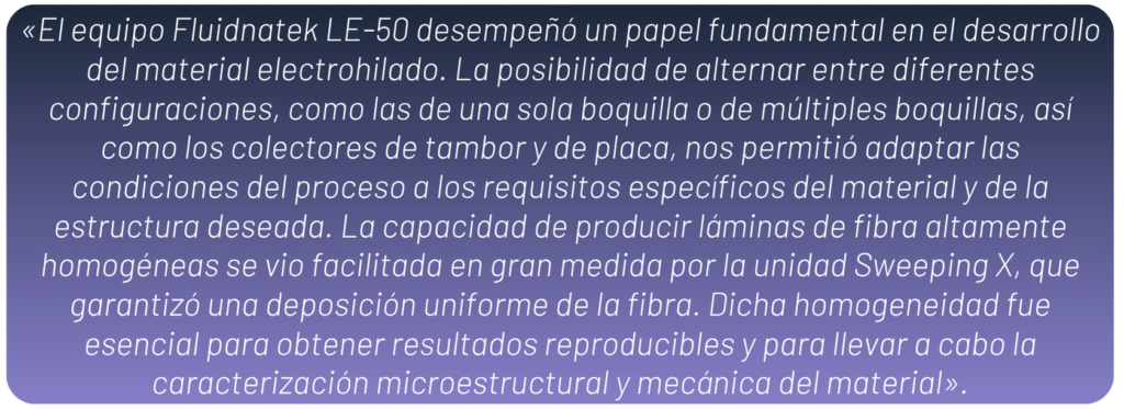 «Desde nuestro punto de vista, el equipo Fluidnatek LE-50 desempeñó un papel fundamental en el desarrollo del material electrohilado. Su configuración sencilla y fiable permitió optimizar rápidamente el sistema de materiales, lo que nos permitió ajustar de manera eficiente los parámetros de procesamiento y realizar iteraciones en las formulaciones en poco tiempo.